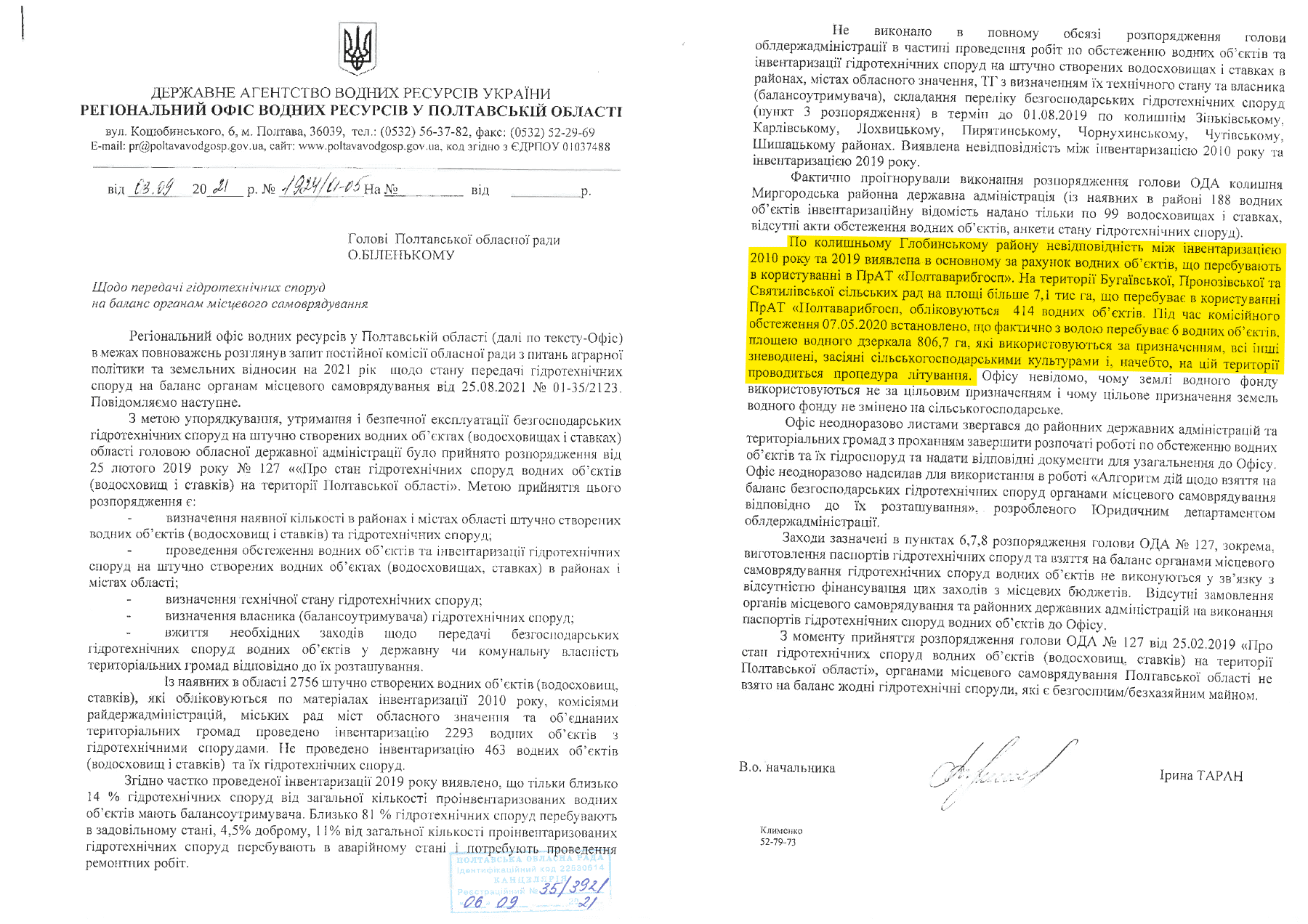 Региональный офис водных ресурсов в Полтавской области 3 сентября обратился к председателю Полтавского областного совета Александру Беленькому с письмом «Относительно передачи гидротехнических сооружений на баланс органам местного самоуправления».