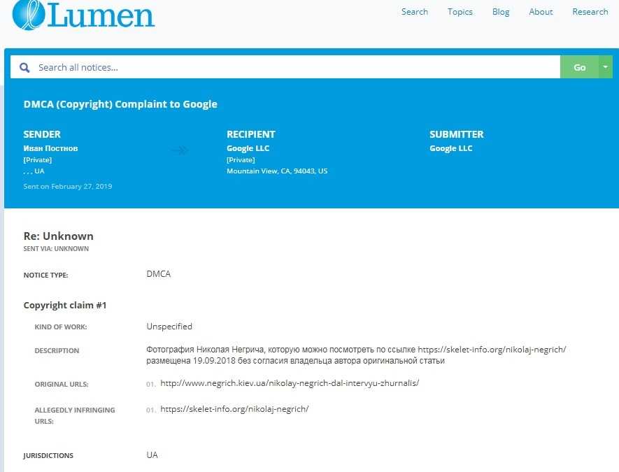 Далее слово коллегам с издания Скелет-инфо. В адрес этого сайта пришло уведомление от сервиса Lumen о том, что его ссылка на досье и компромат по депутату Киевсовета Николаю Негричу удалена из поисковой выдачи Google.