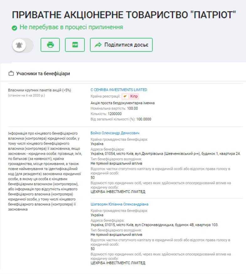 Недавно жена Вилена Шатворяна стала официальным бенефициаром 50% в ПрАТ “Патріот”, где 50% владеет родной дядя Олега Бойко