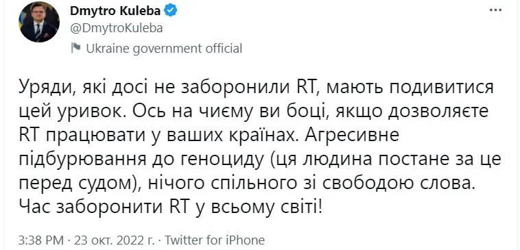 В социальных сетях после этого началось настоящее безумие, отреагировала и Украина: дипломаты призвали запретить вещание телеканала RT там, где он еще доступен, а глава МИД Дмитрий Кулеба заявил, что слова Красовского — это однозначно призыв к геноциду.