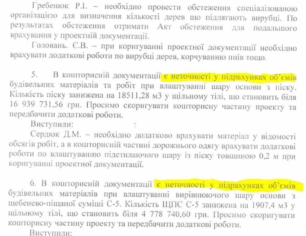 Так, не були враховані 19 000 кубометрів піску на суму 17 млн гривень (майже по 100 тисяч гривень за кубометр, що значно перевищує ринкові ціни) і 1 900 кубометрів ЩПТ С-5 на 4,8 млн гривень.