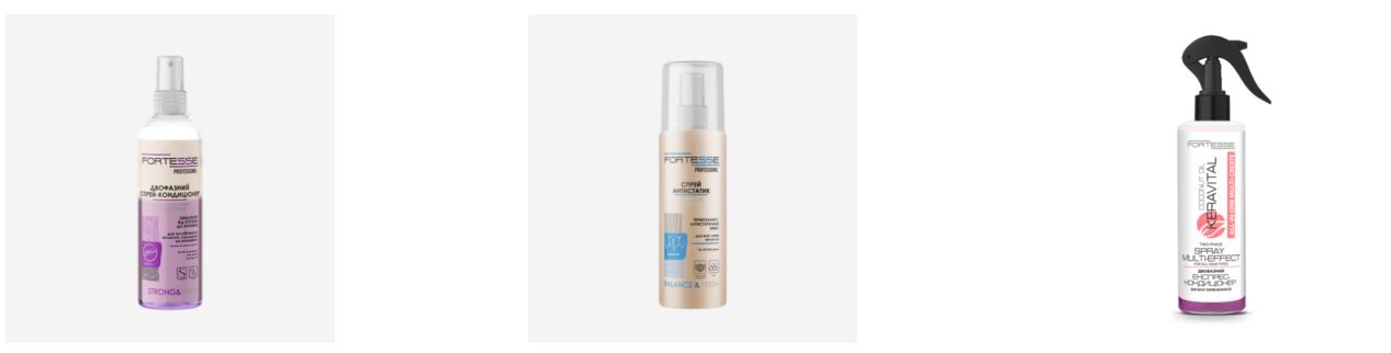 В окрему категорію виділяються спреї для фарбованого волосся, що підтримують стійкість кольору та попереджують тьмяність. Для тих, хто прагне додати волоссю об’єму, пропонуються спреї-молочки Fortesse Volume&Boost, які піднімають волосся біля коренів, не створюючи ефекту важкості. Особливою популярністю користуються двофазні формули Fortesse Repair&Protect і Re:Form Re:Store — вони поєднують догляд і відновлення, забезпечуючи професійний результат після кожного нанесення.