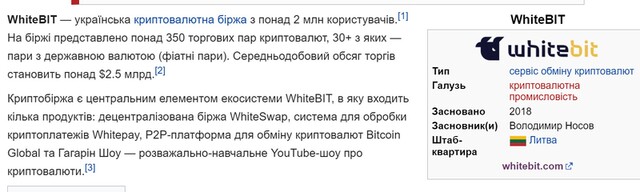 Криптобиржа WhiteBIT позиционирует себя как украинская и в рейтинге лучших криптобирж, представленных в Украине, занимает пятое место. Также ее номинальный владелец Владимир Носов настойчиво подчеркивает о постоянной помощи Вооруженным силам Украины.