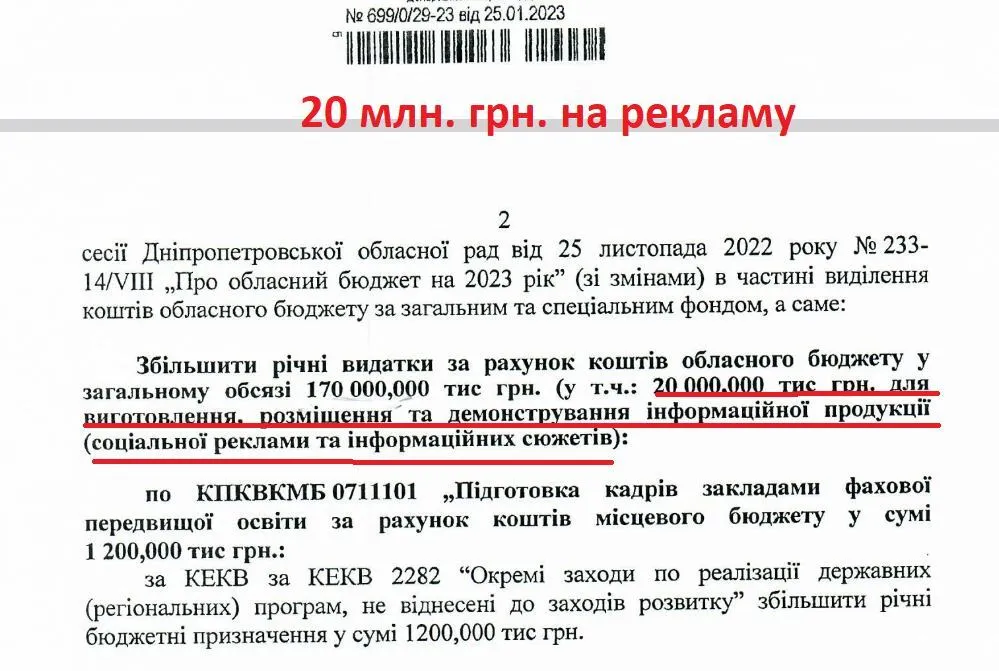 Дніпропетровська облрада під керівництвом голови Миколи Лукашука під час війни виділила з бюджету регіону 20 млн грн на рекламу державних медустанов. Вже оголошені тендери виглядають підозріло: закупівлі проводяться окремо для кожної лікарні, а серед переможців та кандидатів – виключно фірми з орбіти одіозного Загіда Краснова.